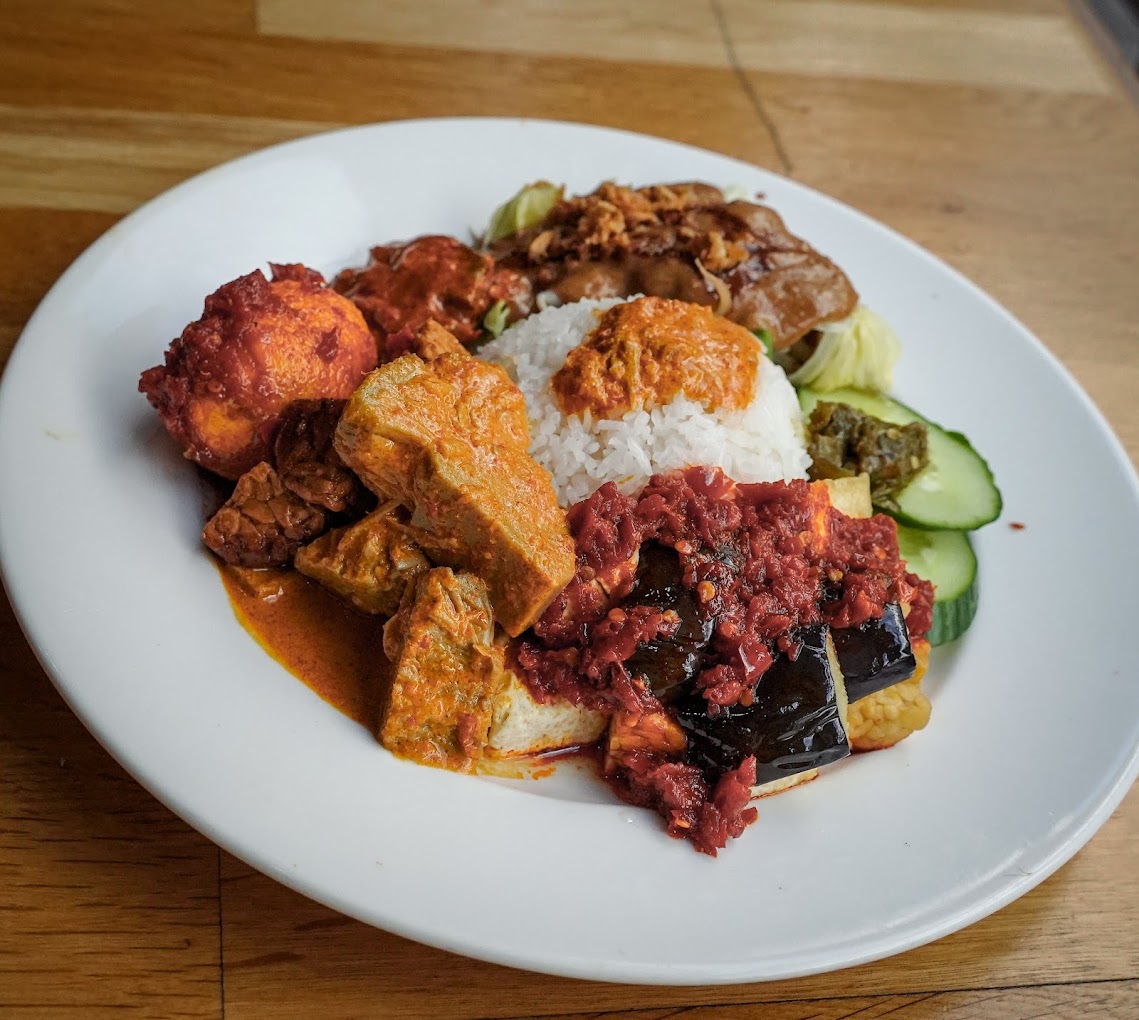 Nasi Putih, Rendang, Kikil, Gulai Nangka, Daun Singkong, Telur Balado, Sambal Hijau, Jengkol, Tauco Padang